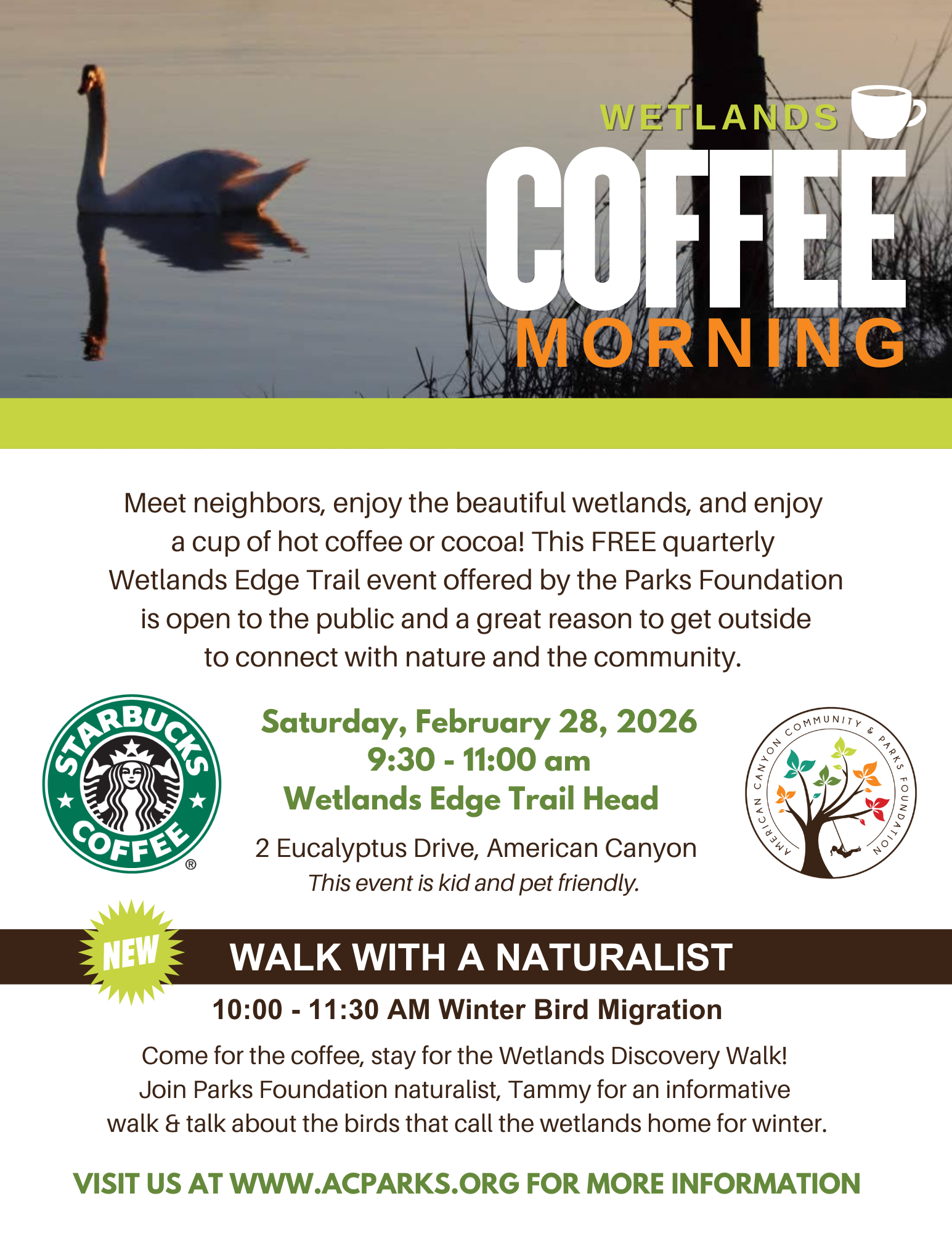 Join the Parks Foundation for our winter Wetlands Edge Coffee Morning and nature discovery walk! Stop by for a cup of FREE Starbucks coffee & meet neighbors. Come for the coffee, stay for the beautiful views!